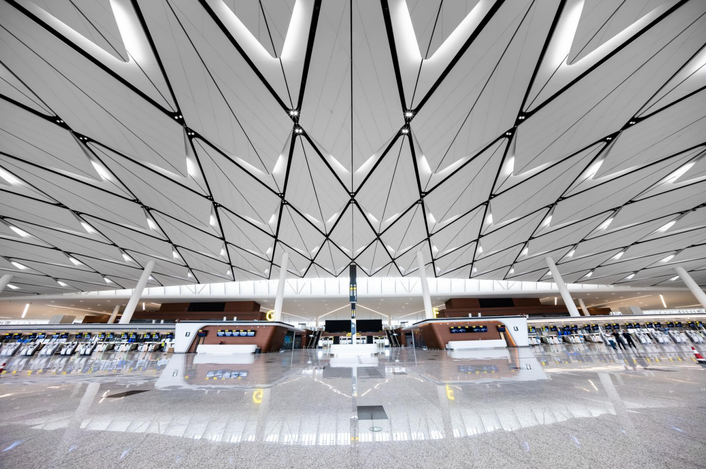 成都天府國際機場為4F級國際機場、是絲綢之路經(jīng)濟帶中等級最高的國際航空樞紐之一,中國首個“手拉手式”航站樓,總面積71萬㎡,每座航站樓有3萬㎡的羽毛狀吊頂與“太陽神鳥”的整體造型呼應 。航站樓共設置83個廊橋機位,能夠滿足2025年2800萬人次國內旅客吞吐量和1200萬人次國際旅客吞吐量的需求。預計本月開通運營。